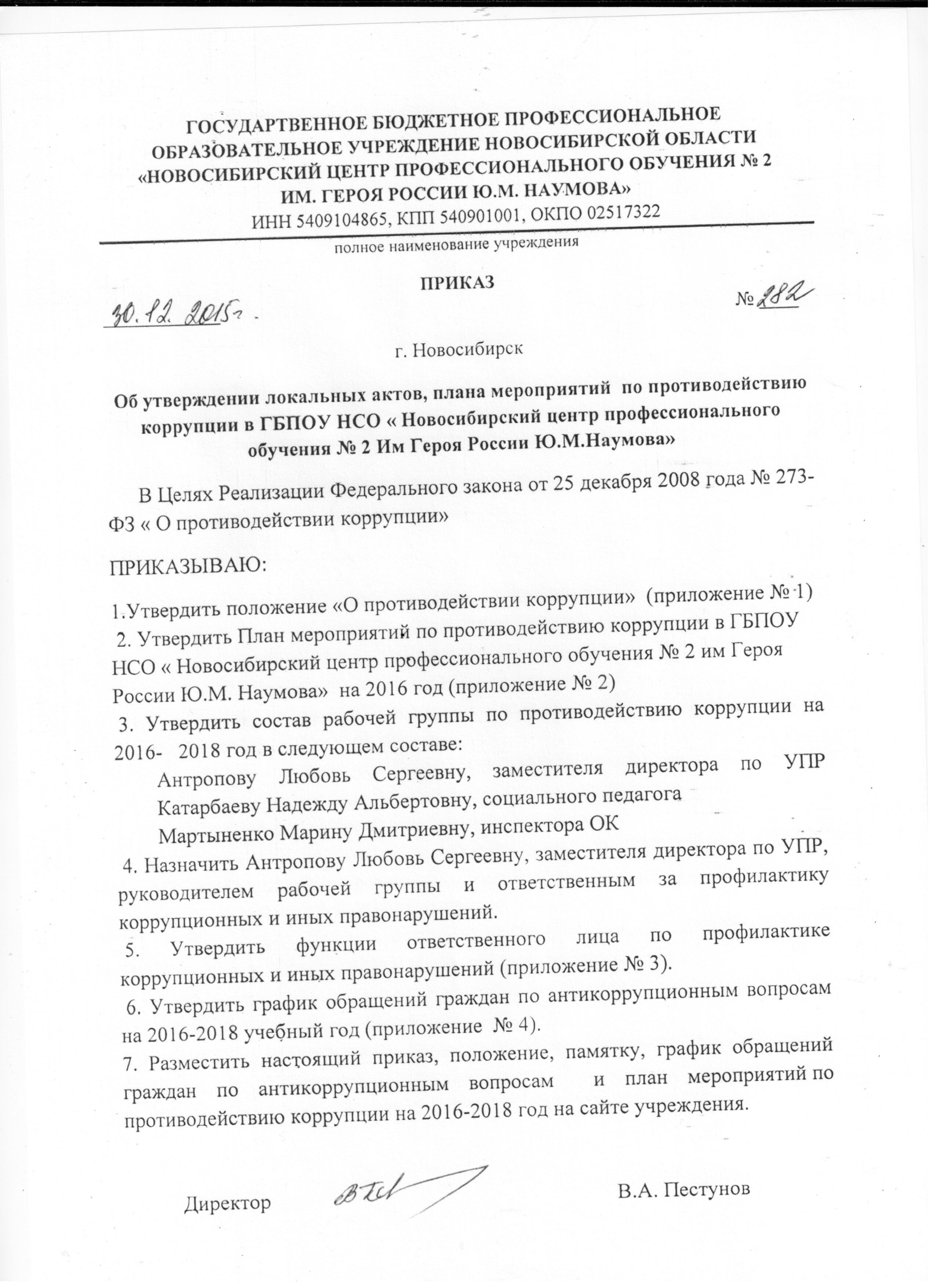 Ссылка Приказ № 282 от 30.12.2015 "Об утверждении мероприятий по антикоррупционной деятельности"